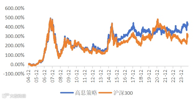 历史数据显示,无论是在上行市、下行市还是震荡市中,红利策略的整体表现都相对稳健。根据Wind数据,截至2024年11月21日,高息策略指数(H30366.CSI)自2004年12月31日基日起至今的累计回报率为425.71%,年化收益率为8.97%,年化夏普比率为0.44,年化波动率为24.72%。对比来看,在这些关键风险收益指标上,高息策略指数表现亮眼。