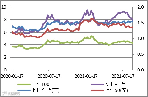 8月的制造业PMI为50.1,低于预期,财新公布的制造业PMI为49.2,已经跌破枯荣线,当前已经是连续5个月的下滑。显示限电限产、原材料涨价、疫情反复等因素对生产端产生一定影响。虽然经济短期有一定扰动,但在政策支持下消费、生产端将稳步复苏。考虑到上半年经济表现出色,我们维持企业盈利持续修复,今年或有较高增长的判断。预计2021年全A业绩增速在20%左右。