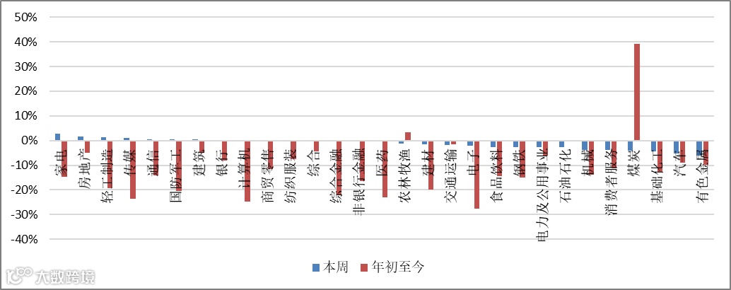 上证综指上周下跌1.54%,报收3186.48点,深证成指下跌2.96%,报收11702.39点,创业板指下跌4.06%,报收2533.02点。两市日均成交额8457亿元,上上周为10140亿元,成交额较上上周下降。周表现较好的行业为家电、房地产、轻工制造、传媒。