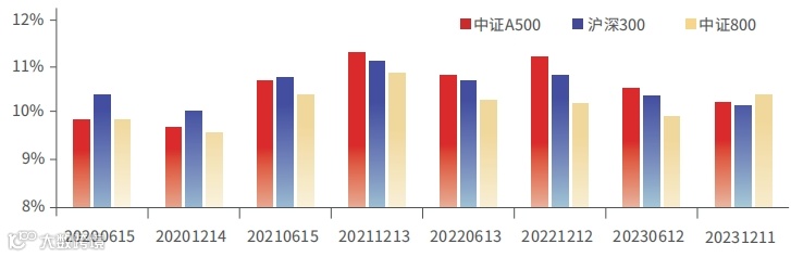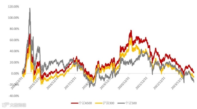 中证500指数基日为2004年12月31日,2019-2023年收益率分别为26.38%、20.87%、15.58%、-20.31%、-7.42%。