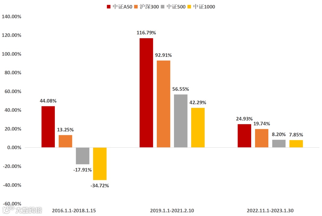 中证A50指数基日为2014年12月31日,2019-2023年收益率分别为43.71%、33.41%、-5.38%、-21.19%、-12.42%。