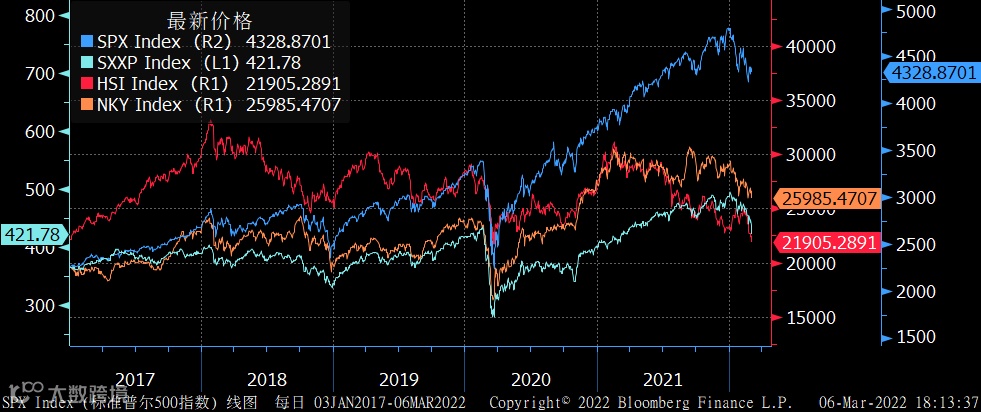 上周标普500指数周跌1.27%,欧洲斯托克600周跌7.00%,日经指数周跌1.85%。