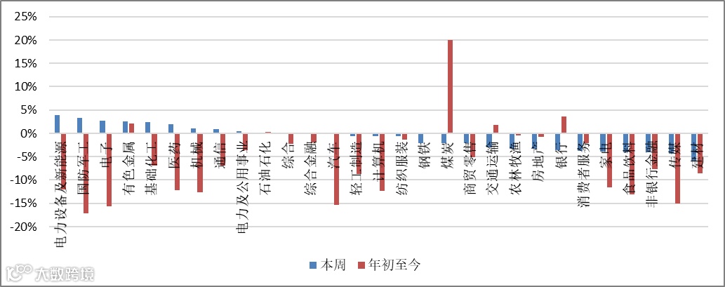 上证综指上周下跌0.11%,报收3447.65点,深成指下跌2.93%,报收13020.46点,创业板指下跌3.75%,报收2748.64点。两市日均成交额9677亿元,上上周为10608亿元,成交额较上上周下降。周表现较好的行业为煤炭、农林牧渔、交通运输、电力及公用事业。