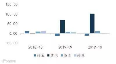 从结构上来看,与上月一致,食品分类中猪肉、鸡蛋价格涨幅扩大,而鲜果、鲜菜同比涨幅大幅回落。本月猪肉CPI 涨幅再度扩大,同比涨幅由上月的69.3%扩大为101.3%,猪价环比上涨20.1%,涨幅比上月扩大0.4 个百分点,占CPI 环比总涨幅的近九成。猪肉对其替代品价格也有所拉动,牛肉、羊肉、鸡肉和鸭肉价格均有所上涨,涨幅在1.0%—3.1%之间,但猪肉价格的上涨暂未明显传导至非食品项中。