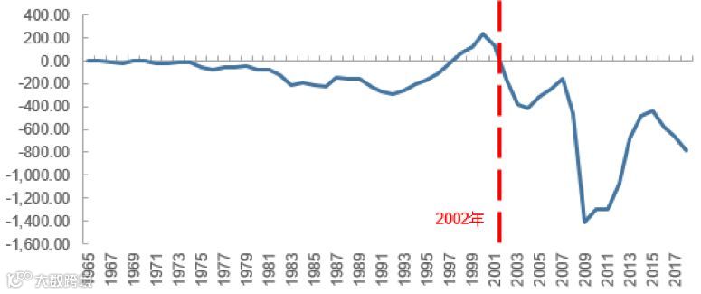 1996 年美元升值带动泰铢升值,同时日元发生了贬值,泰国出口受到重创,造成经济下滑。而国际资本的流入与撤出更加加剧了这个破产过程,导致东南亚各国固定汇率机制的崩塌,造成货币贬值。因此,亚洲金融危机又一次抬升了美元。2001 年6月美元指数达到本轮新高,从1995-2002 年期间,美元指数上涨幅度达到50%。
