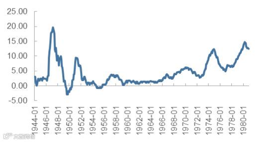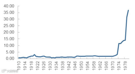 从1971 年1 月到1980 年10 月,美元持续下跌,跌幅超过28%。直到1979 年,强硬的美联储主席保罗·沃克上任后,通胀才得到遏制。沃克认为美国通胀的源头是美元超量供给,因此他决定美联储不在投票决定基准利率,转而直接制定美国货币供应量目标,经由市场,由货币供应量的变化决定利率的变化。