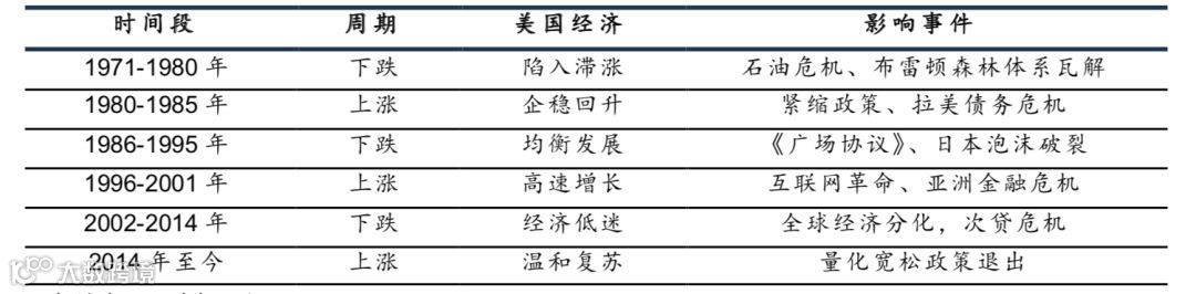 熊长牛短的美元周期。从早期的“殖民票”到国家货币单位,再到公认的世界货币,从1690 年以来,美元经历了众多演变。美元是世界上最重要的国际化货币,美元周期的变动会通过全球资本流动,贸易一体化等方式对世界其他国家产生深刻影响。从布雷顿森林体系瓦解之后,我们根据美元指数的涨跌,将美元分为三个周期。从过去经验来看,美元长期是下跌的。并且美元周期下跌时间长,而上涨时间短,每一轮的美元高点都不及上一轮周期。美元上涨持续的时间一般6 年,美元下跌的持续时间一般为10-13 年,一个周期持续时间约16 年。
