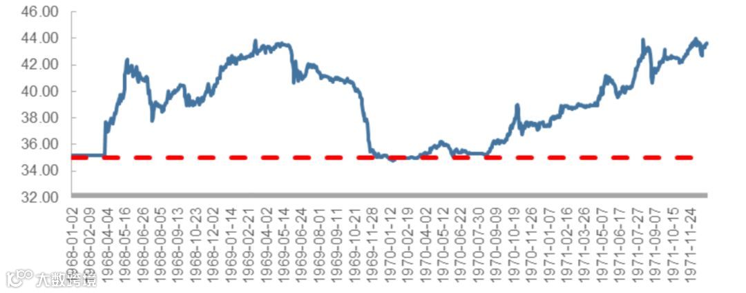 事实也确实如此,从50 年代后期开始,美国经济竞争力逐渐削弱,国际收支开始趋于恶化,出现了全球美元过剩的情况,各国纷纷抛出美元兑换黄金,1971 年,1月份黄金价格尚为1944 年制定的35 美元每盎司标准,到了8 月份,每盎司黄金价格快速攀升到42 美元。