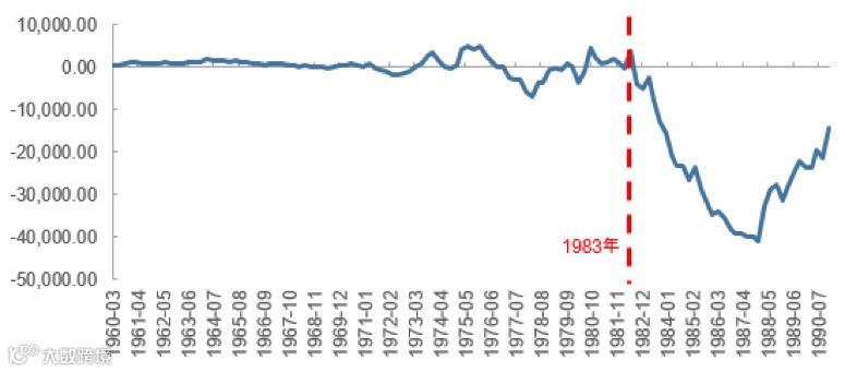 与此同时,1980 年11 月里根当选为美国第40 任总统。里根采纳了芝加哥学派的建议,以强力缩减货币供应量,遏制通货膨胀,并推行新经济政策,结合沃克的强势货币政策,美国通胀逐渐得到克制。1980 年开始,美元指数强劲上升,美元进入第一轮升值周期。但本轮周期美元指数可以冲高到160.41 的水平不仅仅与美国国内政策有关。