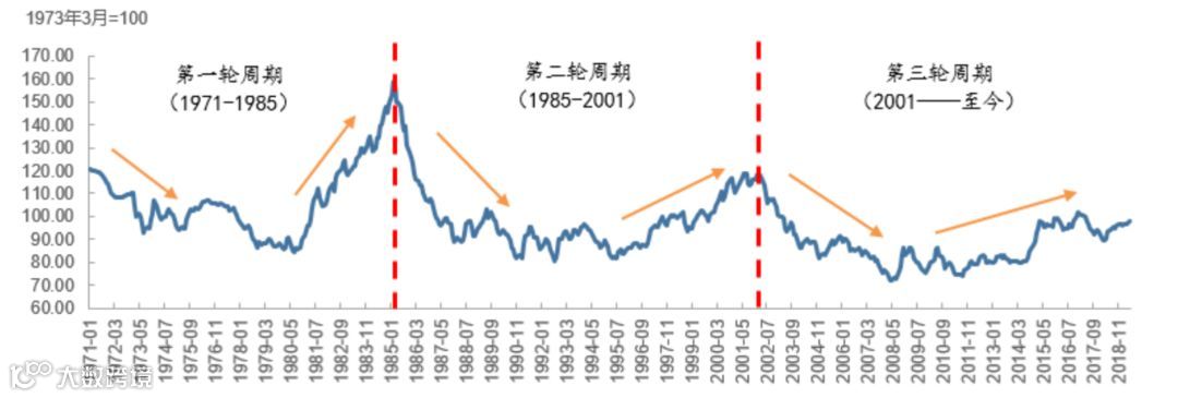 自2011 年5 月以来,美元指数波动上行,进入一个新的上涨周期。然而,2017年9 月之后美元指数却重拾跌势,当时引发了市场对于本轮美元周期是否已经结束了的担忧。但从2018 年4 月以来,美元指数又开始止损转升,慢慢开始回升。截至2019 年6 月,美元指数还处在上升周期当中。本轮美元周期究竟何时才会终结,本文通过对过去几轮美元周期的回顾 ,来分析和判断本轮美元周期的走势。