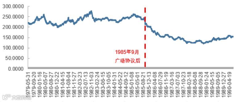 在本轮贬值周期当中,美元对日元贬值幅度最大。在广场协议生效后,日元就开始急速升值。1985 年9 月到1985 年12 月,仅仅三个月日元升值近20%。