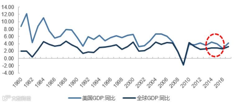 从2008 年金融危机以后,由于受到避险情绪影响,加上美联储持续降息,美元出现了很长一段时间的震荡走势。直到2014 年年中开始,美元指数开始出现反弹回升。影响本轮美元升值的主要原因是全球经济分化,美国经济稳步复苏,而欧美等国家经济未见起色。2014 年美国GDP 增速高于1.56 个百分点,2015 年高于全球1.14 个百分点。并且美联储在2015 年率先开始了加息,而当时的欧洲央行和日本央行还在宽松的货币政策中无法脱身。美债收益率的提高,提升了美元的吸引力,加速了美元回流,对强美元周期提供了有力支撑。