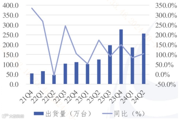 图:各季度我国折叠屏手机出货量(万台)及同比
