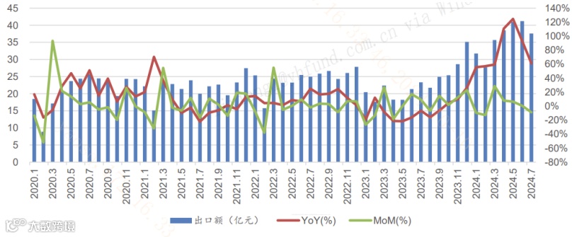 数据端,我国光模块企业今年以来出口表现亮眼。2024年1-7月,我国光模块出口总额达253.4亿元,同比大增79%。我国作为光模块生产大国,海关数据的高增长印证了AI驱动下的光模块行业高景气。
