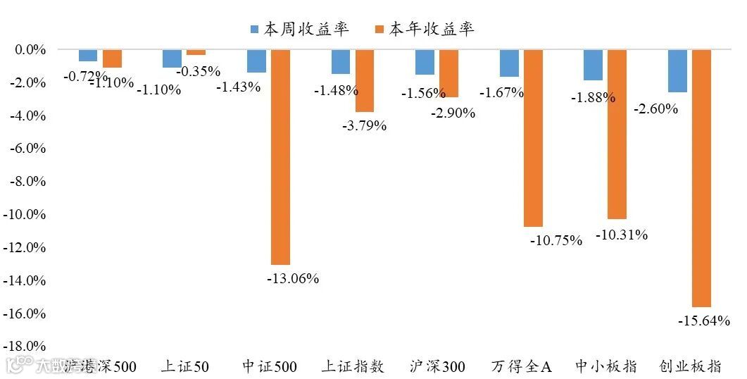 本周市场整体下跌,大盘股表现优于小盘股。万得全A下跌1.67%,沪深300下跌1.56%,创业板指下跌2.60%。