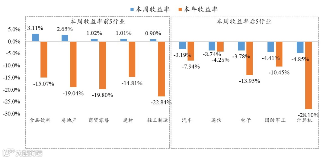 本周涨跌幅较高的行业为食品饮料、房地产、商贸零售、建材、轻工制造,本周收益率分别为3.11%、2.65%、1.02%、1.01%、0.90%。计算机、国防军工、电子为本周收益排名靠后的行业。