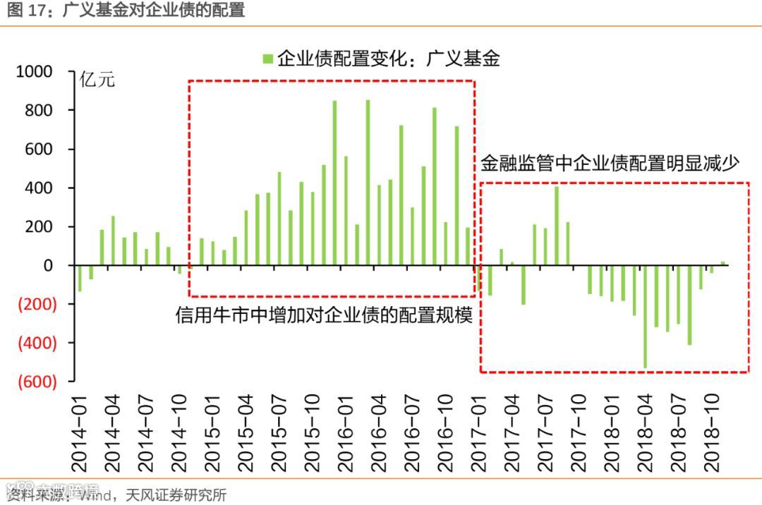 在2015-2016年的信用债牛市中,广义基金具有比较明显的持续增配企业债的行为,连续多个月份大规模增持企业债;