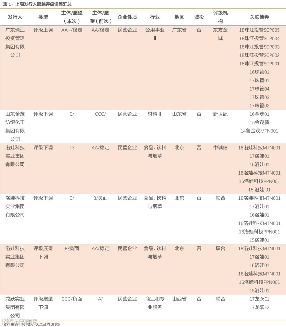 本周4家发行人及其发行债券发生跟踪评级调整,1家上调,3家下调。上周评级一次性下调超过一级的发行主体:洛娃科技实业集团有限公司、龙跃实业集团有限公司、山东金茂纺织化工集团有限公司。