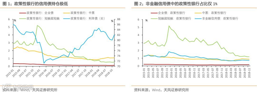 政策性银行主要持有利率债和同业存单,在其总的债券托管规模(中债登和上清所数据)中,各类利率债持仓占比在80%左右,同业存单占比波动较大,2018年维持在13%左右,而以企业债、中票、短融超短融为代表的非金融企业信用债(本文所称非金融企业信用债特指企业债、中票和短融超短融)在政策性银行持仓中的比例仅不到2%。