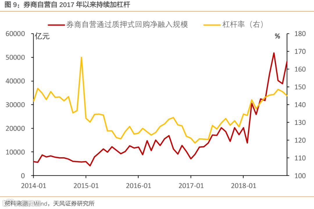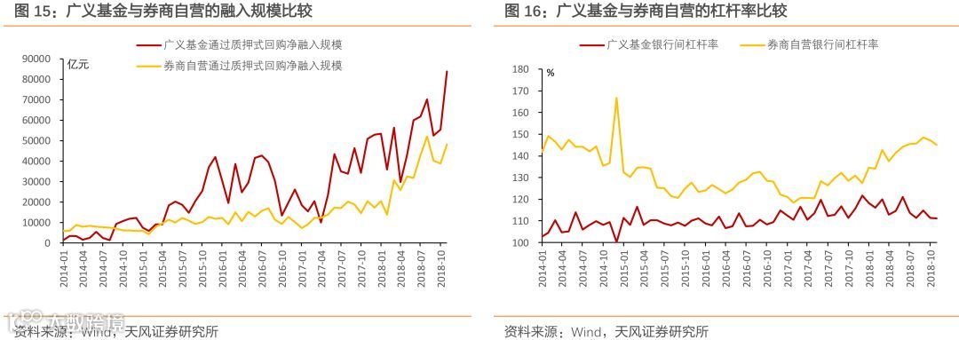 从实际情况来看,广义基金的融入规模明显高于券商自营,两类机构加杠杆的阶段并不相同。广义基金在2015-2016和2017年下半年至今均有明显的扩大资金融入行为,但是在这一些信用风险比较高的阶段,其资金融入情况有所回落(4、8、9月份);而券商自营则在2018年开始快速增加了资金融入规模,导致其杠杆率快速攀升,对比来看,券商自营具有明显高于广义基金的风险偏好。