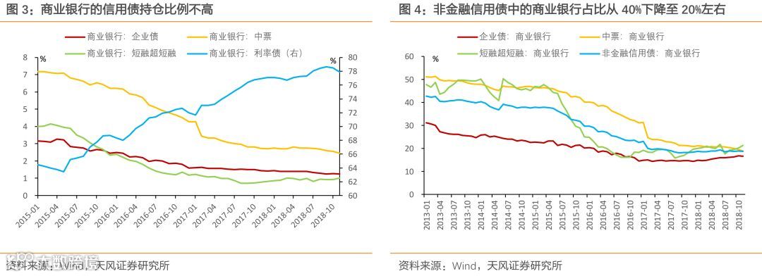 但是,商业银行持有的非金融企业信用债的绝对规模依然比较大,2018年11月份的非金融企业信用债总持仓接近2万亿,在所有非金融企业信用债中的比例接近20%,商业银行对非金融信用债配置行为的变化仍然会对信用债带来比较大的影响。