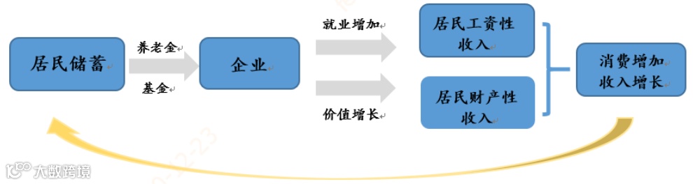 硬币的另一面,是居民的资产配置结构的变化。中国老百姓最重要的两样财富,是住房和银行存款。大众把钱存到银行,获取利息收入,银行再把钱借给企业。这是历史上资金的主要循环途径。与直接融资发展相适应,我们很欣喜的看到,养老金、保险资金投资权益资产的比例在逐步提升,老百姓购买权益类基金的占比也在提升。这件事情之所以重要,是因为长期来看,权益类资产的回报率要高于银行利率。居民资产配置的变化,结果是普通大众可以共享企业发展带来的价值增长。下面这幅图,总结了这个良性的经济循环。