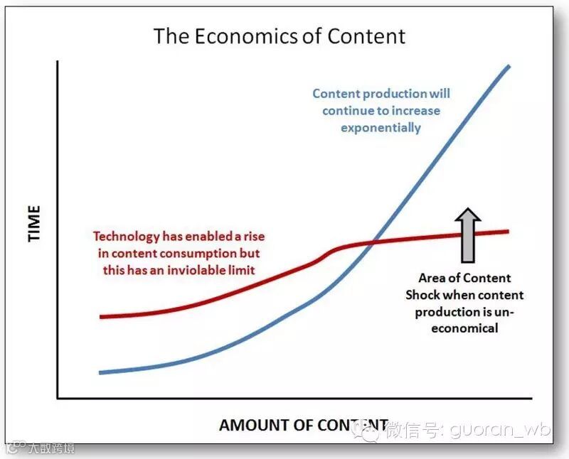 畅销书作者马克 · 谢弗(Mark Schaefer)在去年发表了一篇名为「内容的冲击」的博文,这篇文章在当时引起了巨大反响。在文中,谢弗表明依托内容的营销方式或许已经不再具有可持续性。他认为随着内容的产量越来越多,我们的接受程度将难以与之匹配,因此在不久的将来内容营销的方式将会收效甚微。一旦信息的产出超过了某个界限,继续生产内容不会再为我们带来正面的经济效益。