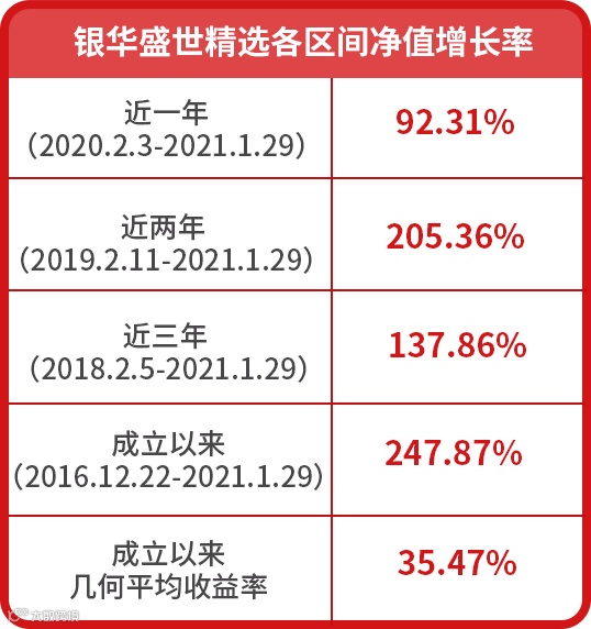 注:基金业绩、成立以来几何平均收益率数据来源:银河证券;近一年、近两年、近三年、成立以来同期业绩比较基准收益率依次为16.28%、32.80%、20.57%、32.10%,业绩基准、上证指数数据来源:Wind;截至日期:2021.1.29,业绩数据已经托管行复核