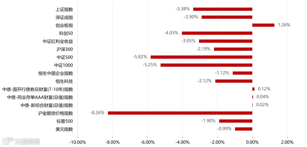 债券&商品市场方面,债市韧性显现,中债-国开行债券总财富(7-10年)指数上涨0.12%,中债-新综合财富(总值)指数微涨0.02%,黄金作为传统避险资产,但上周走势却呈现显著背离,核心在于中东冲突推升油价后,市场通胀预期再度升温,美联储降息预期被大幅推迟甚至出现年内不降息的讨论,持有黄金的机会成本上升。此外,自年初以来黄金累计涨幅较大,在市场风险偏好急剧回落的阶段,获利了结与流动性挤兑需求共同导致黄金遭遇显著抛售,后续一段时间内避险光环褪色。伦敦金跌10.49%,沪金跌8.26%。