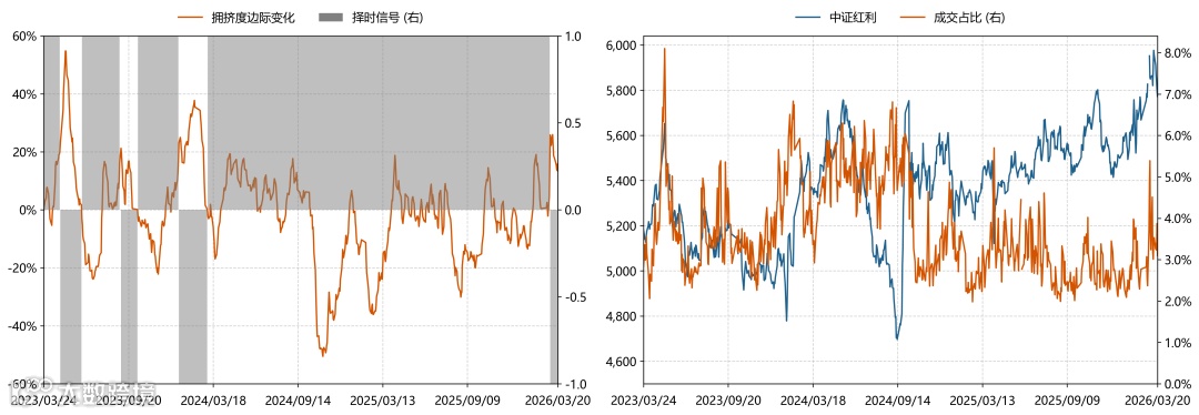 中证红利指数股息率约为4.62%,从景气度、波动率和股息率三维度打分模型来看,红利风格里面的电力与公用事业、消费者服务、交运打分排名靠前。短期拥挤度来看,当前中证红利指数的成交占比处于历史较低水平,拥挤风险较低。