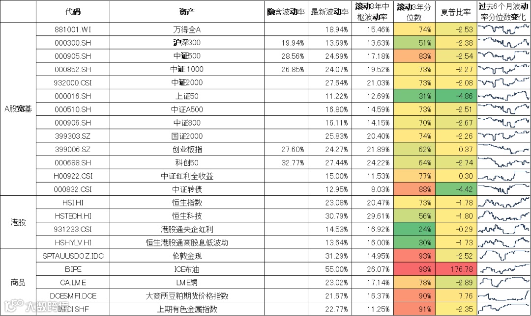 市场上周显著回调,历史波动率平稳,隐含波动率回升。隐含波动率方面,市场恐慌情绪逐步发酵,偏大盘指数处于历史中枢偏高水平,中盘指数处于历史偏高水平。历史波动率方面,目前没有波动率还处于绝对低位的权益资产;结构上看,大市值宽基、港股红利整体波动率水平低于A股,可以继续关注。