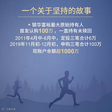 但是这世界上,总是会有人愿意坚持到最后的。小到顾佳盘下亏损的茶园后,每天坚持着去推销她的茶叶,大到王漫妮学会坚持本心,为自己而活,终究建立自信去追求更广阔的个人成长空间。更有甚者,为一个简单的投资,坚持了近14年,这就我们要说的第二个故事,另一个持有人B,也是在银华富裕首次发行中就认购了,当时买了100万元。此后市场走牛,迎来一轮波澜壮阔的牛熊市,市场波动极大,但持有人B却没有向其他人一样赎回。果不其然,在基金经理优秀的投资策略中,银华富裕业绩屡创新高。