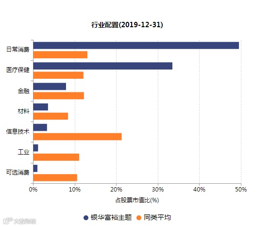 从焦巍管理的银华富裕的行业配置来看,截至2019年12月31日,该基金日常消费和医疗保健占比较高。
