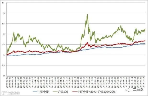 资产配置不仅在成熟市场有效,对新兴市场也同样适用。我们简单以2009-2019十年间的中证全债指数和沪深300指数为例,用中证全债*80%+沪深300*20%构建一个简单的组合。十年间年度最高收益为18%,最大亏损为2.39%(来源:wind),可以获得一个低于股市波动又优于债市收益的稳健回报。从上图可以看出,组合净值曲线走势较为平滑,稳步向上。