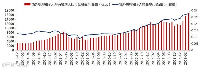 央行数据显示,2019年第一季度,外资持有A股总市值1.68万亿,占总市值比为2.76%,与公募、保险持股差距进一步缩小。