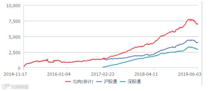 Wind数据显示,截至2019年6月5日,自沪港通开通以来北向资金合计流入7040亿元,相对于2018年5月31日的4792亿元,近一年时间里增长了2248亿元。
