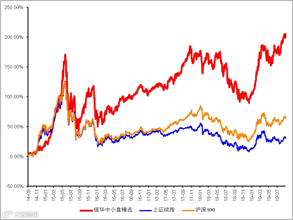 (银华中小盘精选于2012年06月20日成立,自成立以来收益率390.64%,同期业绩基准为5.53%,数据截止至2019.9.20,数据来源:Wind。本基金近6年完整会计年度业绩为:2018年-27.58%、2017年27.72%、2016年-2.86%、2015年90.57%、2014年34.00%、2013年25.92%,2019年上半年41.62%,数据来源:基金定期报告)
