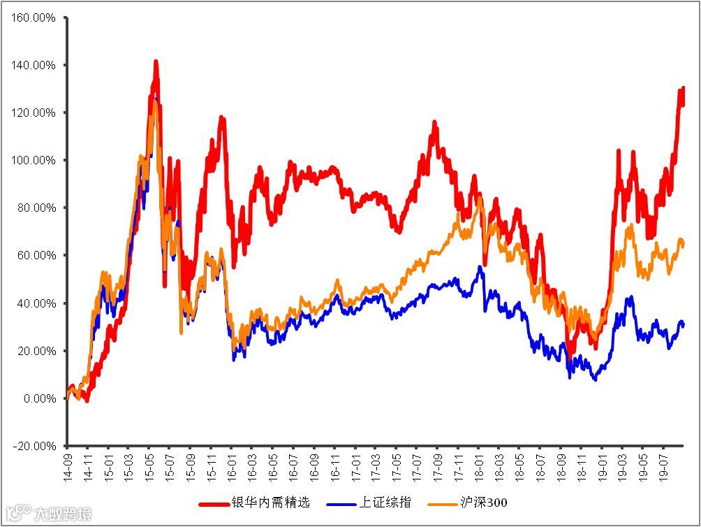 (银华内需精选于2009年07月01日成立,自成立以来收益率108.24%%,同期业绩基准为31.79%,数据截止至2019.9.20,数据来源:Wind。本基金近9年完整会计年度业绩为:2018年-33.25%、2017年-0.12%、2016年-13.70%、2015年86.95%、2014年25.03%、2013年20.38%、2012年2.27%、2011年-41.78%、2010年5.96%,2019年上半年41.79%,数据来源:基金定期报告)