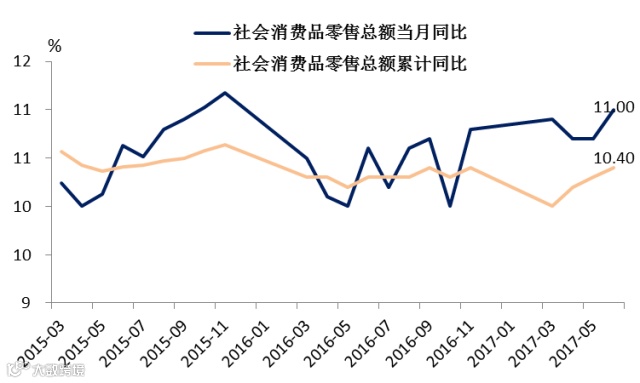 上半年社会消费品零售总额同比名义增长11.0%,增速比上月增加了0.3个百分点,而实际增速10.0%,较上月上升0.5个百分点。6月CPI同比1.5%,与5月份持平,通胀因素对名义消费额的支撑作用较为明显。一季度消费支出对GDP增速拉动为5.3%,对整体的贡献率为77.2%,相比去年四季度有所上升,且增速仍维持高位,对年内GDP增速的支撑作用表现强劲。