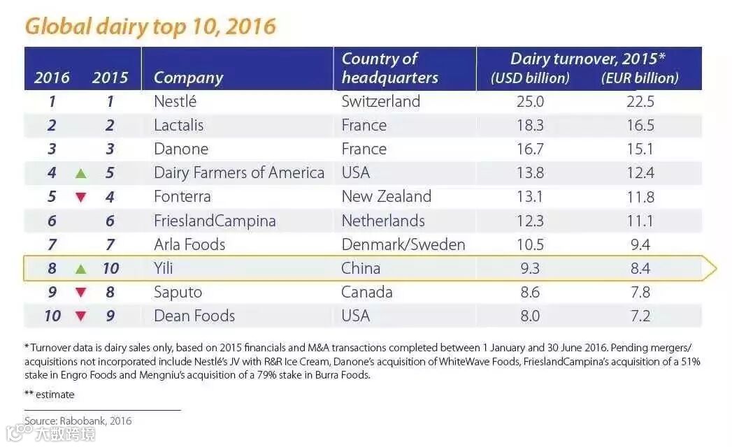荷兰合作银行发布的2016年度“全球乳业20强”榜单