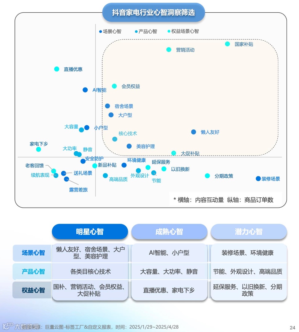 心智营销下,品牌短期利用政策窗口期发力优势赛道,重点关注国补权益、懒人友好等心智,结合强安装类家电、品质健康类家电等政策覆盖品类,快速布局占位提升销售转化。