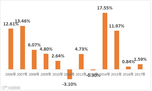 Wind数据显示,从2006年-2017年的12年间,公募债券型基金在大部分年份的平均收益均为正。