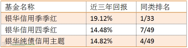 银河数据显示,截至今年6月1日的最近三年,邹维娜管理的银华信用季季红债券、银华信用四季红债券、银华纯债信用债券分别取得了19.12%、14.48%、14.82%的回报,在同类基金中排名领先。