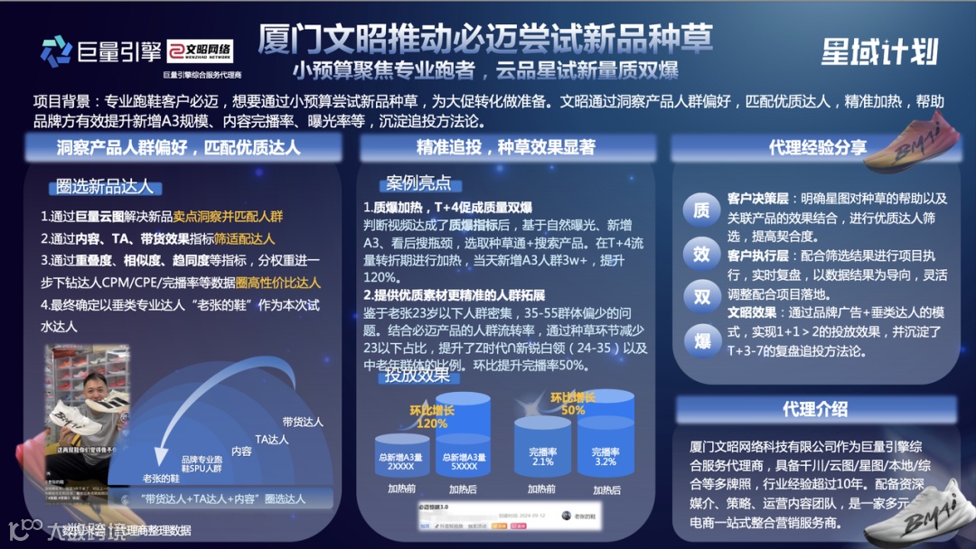 案例背景:专业跑鞋客户必迈,想要通过小预算尝试新品种草,为大促转化做准备。文昭通过洞察产品人群偏好,匹配优质达人,精准加热,帮助品牌方有效提升新增A3规模、内容完播率、曝光率等,沉淀追投方法论。