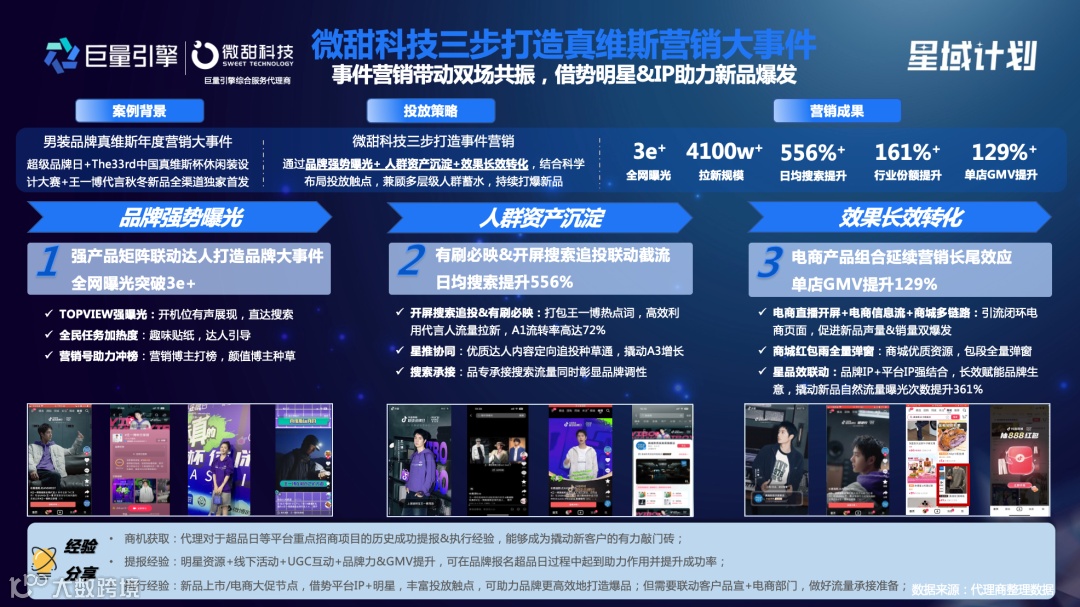 2、执行经验:新品上市/电商大促节点,借势平台IP+明星,丰富投放触点,可助力品牌更高效地打造爆品;执行过程中需要联动客户品宣+电商部门,做好流量承接准备