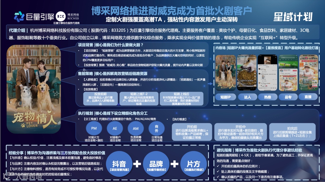 案例背景:“短剧营销”成为品牌营销新方向,火剧项目有稳定且强大的片方支撑,将小程序短剧形式和品牌打通合作。博采成功推进耐威克成为首批合作客户,为品牌提供巨大曝光空间的同时,以更低的CPM覆盖更多目标用户。