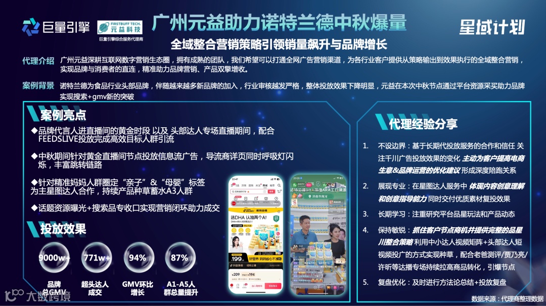 案例背景:伴随行业竞争加剧,行业审核越发严格,诺特兰德作为行业头部品牌,整体投放效果下降明显,元益在本次中秋节点助力品牌实现搜索+GMV的新突破