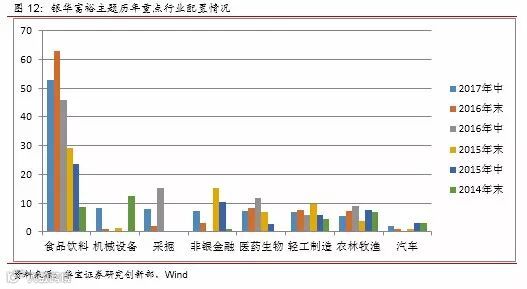 值得注意的是,银华基金从16年下半年行情启动前就开始提前布局食品饮料行业,之后随着行业的上涨又逐步提高占比,这一准确的判断为银华提供了丰厚的回报。与此同时,也提高了基金的行业集中度,17年前三大行业的平均集中度超过50%,需要注意行业风险。