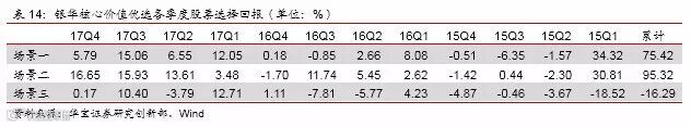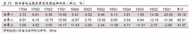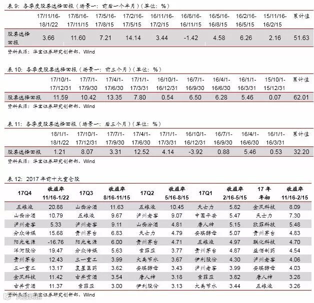 从选股上看,我们采用与上文相同的方法,分三种场景考核选股能力(场景一考核季报持仓前后一个半月的表现;场景二考核季报持仓前三个月的表现;场景三考核季报持仓后三个月的表现)。从结果上看,场景一、场景二的收益显著高于场景三,说明基金经理更多地参与了中后段的行情,因此退出时点变得很重要,由于我们无法获知具体时间,对选股能力暂不下判断。但17年以来的选股能力获得了显著的提升,三种场景下各季度基本都呈现出正贡献。