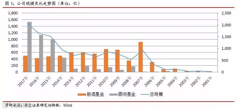 从规模上看,公司在06、07年借助大牛市,股混基金的规模快速增长,但随着08年股灾来临,规模所有下降;14年至17年,公司借助货币基金迎来了第二次高速增长期。根据Wind数据,截止至17年底,公募规模达到2059.59亿元,剔除货币基金后规模619.09亿元,业内位于第20位,其中股混基金规模493.79亿元,业内位于第18位。